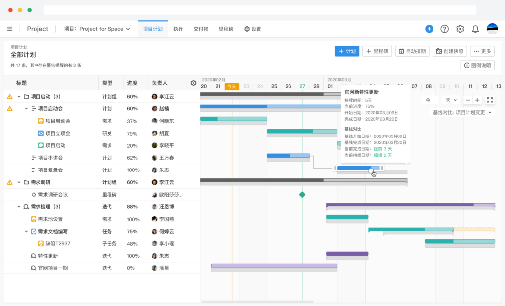 基线包不是只存在于PPT。在版本/迭代层面把承诺落到系统里,后续才好做偏差对比。比如 ONES Project 在实践案例里强调了产品版本与迭代规划;并且在甘特图场景下提供“基线对比”的思路,用来直观看当前与计划偏差。